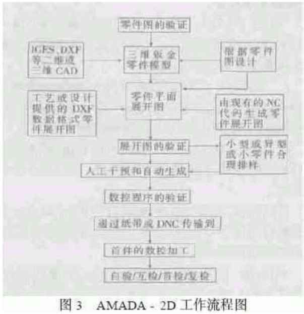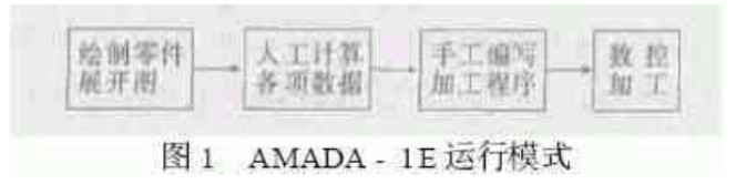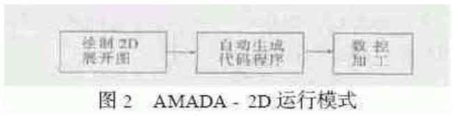 由于處于一種人工繪制展開圖、計(jì)算各項(xiàng)數(shù)據(jù)、手工輸入狀態(tài),因而編程效率非常低;另外,文件管理系統(tǒng)有限,不便丁貯存、管理、查詢程序文件。特別是我所軍民品生產(chǎn)任務(wù)工作量大,品種繁多,如果不建立產(chǎn)品的程序文件數(shù)據(jù)庫(kù),將會(huì)出現(xiàn)人量不必要的重復(fù)勞動(dòng)。1.3 這種局面的存在嚴(yán)重地制約了我所軍民品牛產(chǎn)任務(wù)的需要,為進(jìn)一步提高加工效率,縮短加工周期、提高加工精度,使先進(jìn)的設(shè)備能更好的服務(wù)'T科研牛產(chǎn),經(jīng)過(guò)對(duì)市場(chǎng)上的數(shù)控沖床編程軟件允分地調(diào)研、分析、論證,我所于2002年將AMADA - 1E編程系統(tǒng)升級(jí)為AMADA - 2D編程系統(tǒng)。其運(yùn)行模式如圖2所示。
