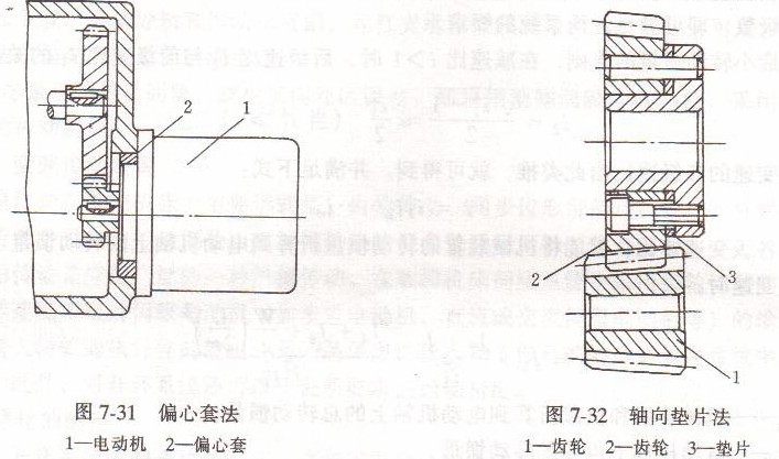 1)偏心套調(diào)整法如圖7-31所示,將相互嚙合的一對齒輪中的一個齒輪裝在電動機輸出軸上,并將電動機1安裝在偏心套2(或偏心軸)上,通過轉動偏心套的轉角,就可調(diào)節(jié)兩嚙合齒輪的中心距,從而消除圓柱齒輪正、反轉時的齒側間隙。特點是結構簡單,但其側隙不能自動補償。