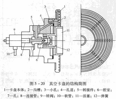 數(shù)控沖床的真空卡盤(pán)的結(jié)構(gòu)原理如圖5-20所示,下面簡(jiǎn)單介紹其工作原理。