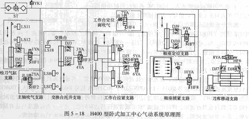 如圖5 -18所示,由于H400加王中心要進行雙工作臺的交換,為了節(jié)約變換時間,保證交換的可靠,工作臺與鞍座之間必須具有能夠快速、可靠的定位、夾緊及迅速脫離的功能??山粨Q的工作臺固定于鞍座上,由4個帶定位錐的氣缸夾緊,為了達到拉力大于12000N的可靠工作要求,以及受位置結柏的限制,該氣缸采用了彈簧增力結構,在氣缸內徑僅為ct>63mm的情況下就達到了設計拉力要求。例如,數控沖床氣動系統(tǒng)原理圖5二18所示,該支路采用兩位雙電控電磁閥HF5進行控制,當雙工作臺交換將要進行或已經進行完畢時,數控系統(tǒng)通過PMC控制電磁閥HF5,使線圈5YA或6YA得電,分別控制氣缸活塞的上升或下降,通過鋼珠拉 套機構放松或拉緊工作臺上的拉釘,完成鞍座與工作臺之間的放松或夾緊。為了避免活塞運動時的沖擊,在該支路采用具有得電動作、失電不動作、雙線圈同時得電不動作特點的兩位雙電控電磁|詡HF5進行控制,可避免在動作進行過程中突然斷電造成的機械部件沖擊損傷。采用單向節(jié)流閥DJ5、DJ6來調節(jié)夾緊的速度,避免較大的沖擊載荷。該位置由于受結構限制,用感應開關檢測放松與拉緊信號較為困難,故采用可調工作點的壓力繼電器YK3、YK4檢測壓力信號,并以此信號作為氣缸的到位信號。