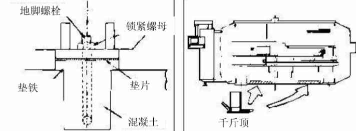 在上轉(zhuǎn)塔盤的X軸、Y軸力向放兩個水平塊。存數(shù)控轉(zhuǎn)塔沖床的地腳部分和摯鐵部分插入墊片,以調(diào)數(shù)控轉(zhuǎn)塔沖床床的水平。用液壓千斤頂抬起機床(見右下角圖)插入墊片。不要抬起電氣控制箱的底部。機床的x軸、Y軸方向的水平范圍在+0.05mm/m。