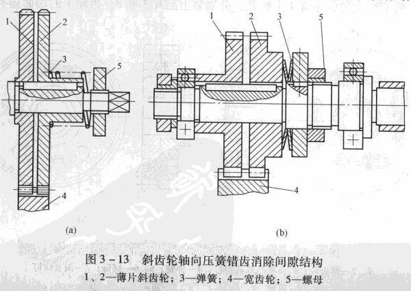 (2)軸向壓簧調(diào)整法。圖3 -13所示為斜窗輪軸向壓簧錯(cuò)齒消除間隙結(jié)構(gòu)。該結(jié)構(gòu)的消除間隙原理與軸向墊片調(diào)整法相似,所不同的是利用齒輪2右面的彈簧壓力使兩個(gè)薄片齒輪的左右齒面分別與寬齒輪的左右齒面貼緊,以消除齒側(cè)間隙。因3 -13 (a)所示結(jié)構(gòu)中采用的是壓簧,圖3-13 (b)所示結(jié)構(gòu)中采用的是碟形彈簧。