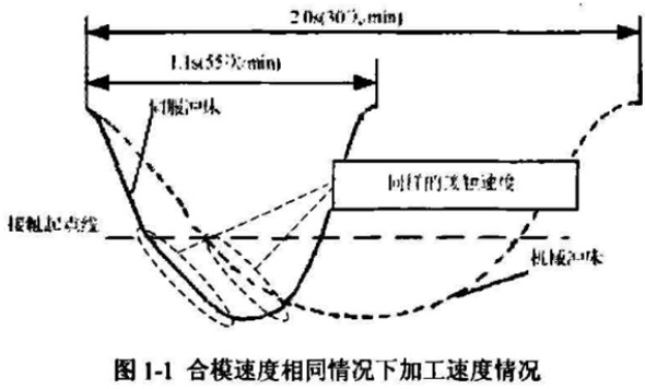 AC伺服沖床采用AC伺服電機作為驅(qū)動源,AC伺服電機的可控性,保證伺服沖床了具備良好的工藝柔性,AC伺服沖床表現(xiàn)出仍意加工的生產(chǎn)特性,可以實現(xiàn)多種多樣的滑塊運動曲線,提高零件成形性.其成形范圍是油壓機的1-5倍以上,拉伸比可提高20%-30%。同時,可將滑塊運動停止進行保壓,可提高高強度鋼板、鋁合金等材料的成形性。采用AC伺服電機作為驅(qū)動源,提高了沖壓效率,特別在沖床加工過程的合模過程中,傳統(tǒng)沖床提高沖壓次數(shù)會給成形帶來不良影響,而降低合模速度,又勢必影響加工效率。采用AC伺服沖床,合模的過程中降低合模時的滑塊速度,提高回升時的速度,可以將生產(chǎn)效率更大提升至190%。同時,因為減小了沖擊,模具壽命了提高3倍。在相同合模速度條件下,伺服沖床與傳統(tǒng)沖床加工速率對比曲線如圖1-1所示。