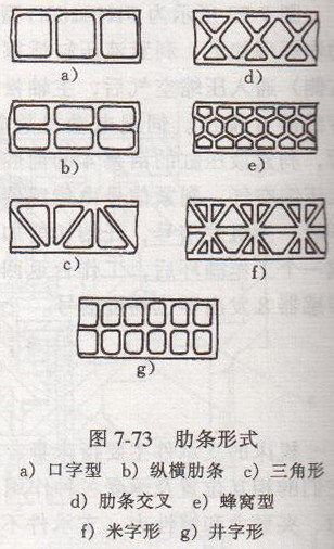 采用合理的結(jié)構(gòu)加大接觸剛度,提高支承件的剛度。整體結(jié)構(gòu)的剛度大于分體的剛度。在支承件分體時(shí),提高表面接觸面積,加大預(yù)緊力,可較好的提高接觸剛度。在支承件自身結(jié)構(gòu)中,在材料截面面積相同的條件下,空心結(jié)構(gòu)的剛度比實(shí)心結(jié)構(gòu)好;封閉式結(jié)構(gòu)的剛度大于開式結(jié)構(gòu)的剛度;方形截面的抗彎剛度大于圓形截面的抗彎剛度,而圓形截面的抗扭剛度高于方形截面的抗扭剮度。根據(jù)受力情況,選擇好截面形狀,能提高支承件的剛度。配置好加強(qiáng)肋板和加強(qiáng)肋,能顯著地提高支承件的剛度。肋板連接了支承件的兩壁,縱向肋板主要提高抗彎剛度,橫向肋板主要提高抗扭剮度,斜向肋板兼有提高抗彎和抗扭剛度。肋條被制在支承件的內(nèi)壁上,主要是為了提高局部剛度,減少局部變形和薄壁振動(dòng)。肋條也有縱向、橫向和斜向的。如圖7-73所示,圖中口字型肋條最簡單;縱橫肋條,直角相交也容易制造,但容易產(chǎn)生內(nèi)應(yīng)力;三角形分布肋條能夠保證足夠的剛度,多用于矩形截面床身的寬壁處;肋條交叉布置,能提高剛度,常用于重要床身的寬壁上;蜂窩型肋條,用于平板上,由于各方面能均勻收縮,所以內(nèi)應(yīng)力?。痪掷邨l其單元壁板的抗彎剛度接近米字形,但剛度是米字形的二分之一。米字形鑄造困難,所以一般鑄鐵床身采用井字形,焊接床身米字型。肋條的高度一般不得大于支承件壁厚的5倍,肋條的厚度一般是床身壁厚的00.8倍。