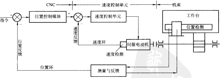 數控機床伺服系統(tǒng)由速度環(huán)和位置環(huán)所組成,如圖所示,這是一個雙閉環(huán)系統(tǒng),內環(huán)是速度環(huán),外環(huán)是位置環(huán)。