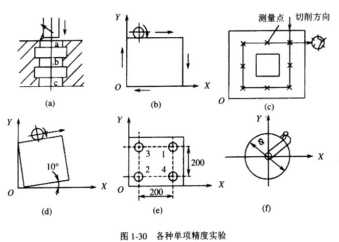 直線性鈍削精度的檢查可按照如圖1-30 (d)所示進(jìn)行,x、Y坐標(biāo)分別進(jìn)給,用立鏡刀側(cè)刃精筑工件周邊;測量各邊的垂直度、對邊平行度、鄰邊垂直度和對邊距離尺寸差。這項精度主要考核數(shù)控沖床各方向?qū)к夁\動的幾何精度。