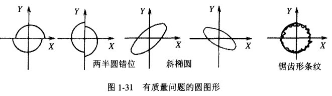 圓弧就削精度檢測如圖1-30(f)所示,是用立鏡刀側(cè)刃精鏡外圓表面,然后在圓度儀上測出圓度幽線。在圓試件測量中常會遇到如圖1-31所示的情況。兩半圓錯位的圖形一般是由一個坐標(biāo)或兩個坐標(biāo)的反向失動量造成的,這種情況可以通過適當(dāng)?shù)馗淖償?shù)控系統(tǒng)失動量的補(bǔ)償值或修調(diào)該坐標(biāo)的傳動鏈來解決。而出現(xiàn)斜橢圓則是由于兩坐標(biāo)實際系統(tǒng)誤差不致造成的,這種情況可以通過適當(dāng)?shù)卣{(diào)整速度反饋增益和位置環(huán)增益得到修正。