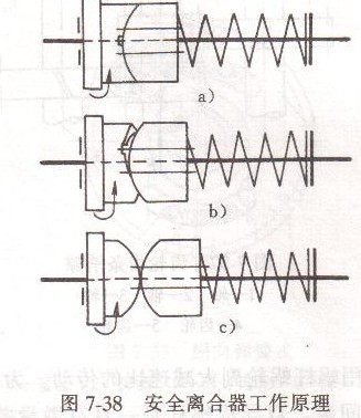 和安全離合器組成。安全離合器的工作原理如圖7-38所示。這樣正常情況下,運(yùn)動(dòng)由安全離合器傳至下一軸。當(dāng)出現(xiàn)過載時(shí),前軸的扭矩增大并超過允許值,這時(shí)通過安全離合器端面螺旋齒傳遞的扭矩也隨之增加,以致使端面螺旋齒處的軸向推力超過彈簧的壓力,于是便將離臺(tái)器右半部推開,這時(shí)離合器左半部繼續(xù)旋轉(zhuǎn),而右半部卻不被帶動(dòng),所以在兩者之間產(chǎn)生打滑現(xiàn)象,將傳動(dòng)斷開,因此使傳動(dòng)機(jī)構(gòu)不致困過載而破壞。當(dāng)過載現(xiàn)象消失后,由于彈簧的彈力,安全離合器自動(dòng)恢復(fù)到原來的正常狀態(tài)。機(jī)床需用的更大進(jìn)給力決定于彈簧的彈力。擰動(dòng)螺母,就可調(diào)整彈簧的彈力。
