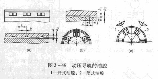 圖3 -49 (a)和( b)中, k段為斜面,其油腔間隙由h2逐漸減小至h1。間隙h1越小,油膜壓力越大,承載能力越強(qiáng)。由于導(dǎo)軌表面租糙度及熱變形等影響,間隙h1不可太小,如龍門刨床工作臺(tái)長(zhǎng)度為2-16m, h1應(yīng)取0.06 -0. 10mm,而h2一般等于2h1。