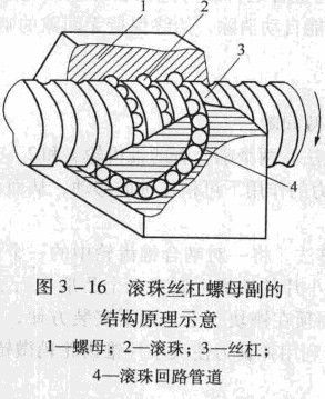 滾珠絲杠螺母副的結(jié)構(gòu)原理示意如圖3 -16所示。在絲杠3和螺母1上都有半圓弧形的螺旋槽,當(dāng)它們套裝在一起時便形成了滾珠的螺旋滾道。螺母上有滾珠回路管道4,將幾圈螺旋滾道的兩端連接起來,構(gòu)成封閉的循環(huán)滾道,并在滾道4內(nèi)裝滿滾珠2。當(dāng)絲杠旋轉(zhuǎn)時,滾珠在滾道內(nèi)既自轉(zhuǎn)叉沿滾道循環(huán)轉(zhuǎn)動,迫使螺母(或絲杠)軸向移動。