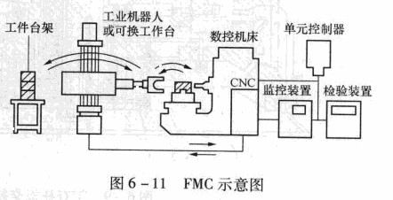 作為柔性制造系統(tǒng)的基本單位是各種制造單元中,它的基本單位就是數(shù)控沖床和工業(yè)機(jī)器人等組成的“加工單元”。圖6 -11所示為柔性制造單元示意圖,它由數(shù)控沖床、工件臺(tái)架、工業(yè)機(jī)器人或可換工作臺(tái)、監(jiān)控裝置、檢驗(yàn)裝置及加工單元的控制器等6部分組成。