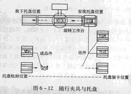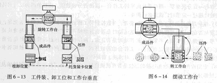 圖6 -13所示為工件裝、卸工位和工作臺(tái)垂直排列,此時(shí)旋轉(zhuǎn)工作臺(tái)必須先移到卸荷工位,將隨行夾具連同成品卸下,然后移到安裝工位,接受裝有坯件的隨行夾具。