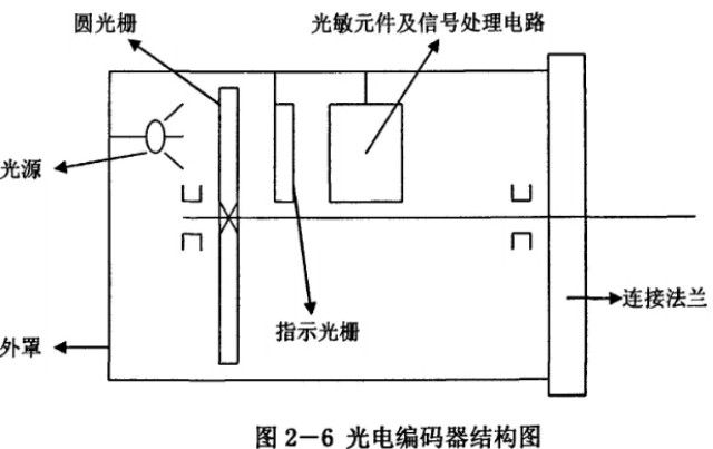 光電式編碼器由電路板、圓光柵、指示光柵、軸、光敏元件、光源和連接法蘭等組成。其中,圓光柵是在一個圓盤上刻有相等間隔角的線紋,分為透明和不透明的部分。指示光柵是與圓光柵位置相對平行的一扇形薄片,上面刻有相差1/4節(jié)距的兩個狹縫和一個零位狹縫,指示光柵的作用是判別光電編碼器的正反轉(zhuǎn)及軸的零位檢測,正反轉(zhuǎn)是通過相差1/4節(jié)距的兩個狹縫的脈沖先后順序來判斷的,零位檢測是通過零位狹縫的脈沖變化來判斷的。光敏元件及信號處理電路接收透過圓光柵和指示光柵的光信號,將其處理為角位移信號并輸出,圓光柵和工作軸一起轉(zhuǎn)動,其他部分包括光源、指示光柵、光敏元件及信號處理電路均與外罩固定。