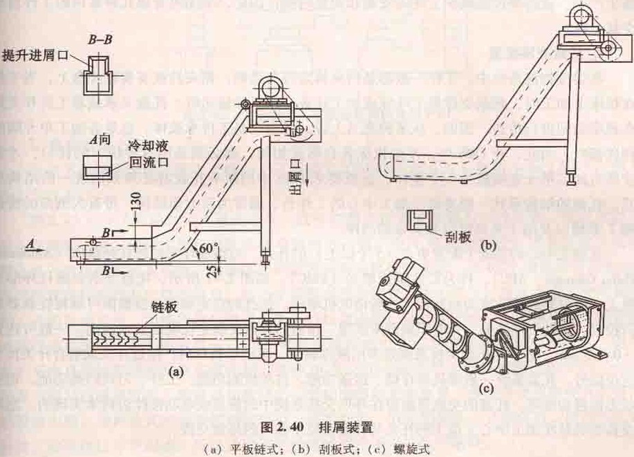 該裝置的傳動(dòng)原理與平板鏈?zhǔn)交鞠嗤,只是鏈板不同,帶有刮板鏈板,如圖2.40(b)所示、這種裝置常用于輸送各種材料的短小切屑,排屑能力較強(qiáng),